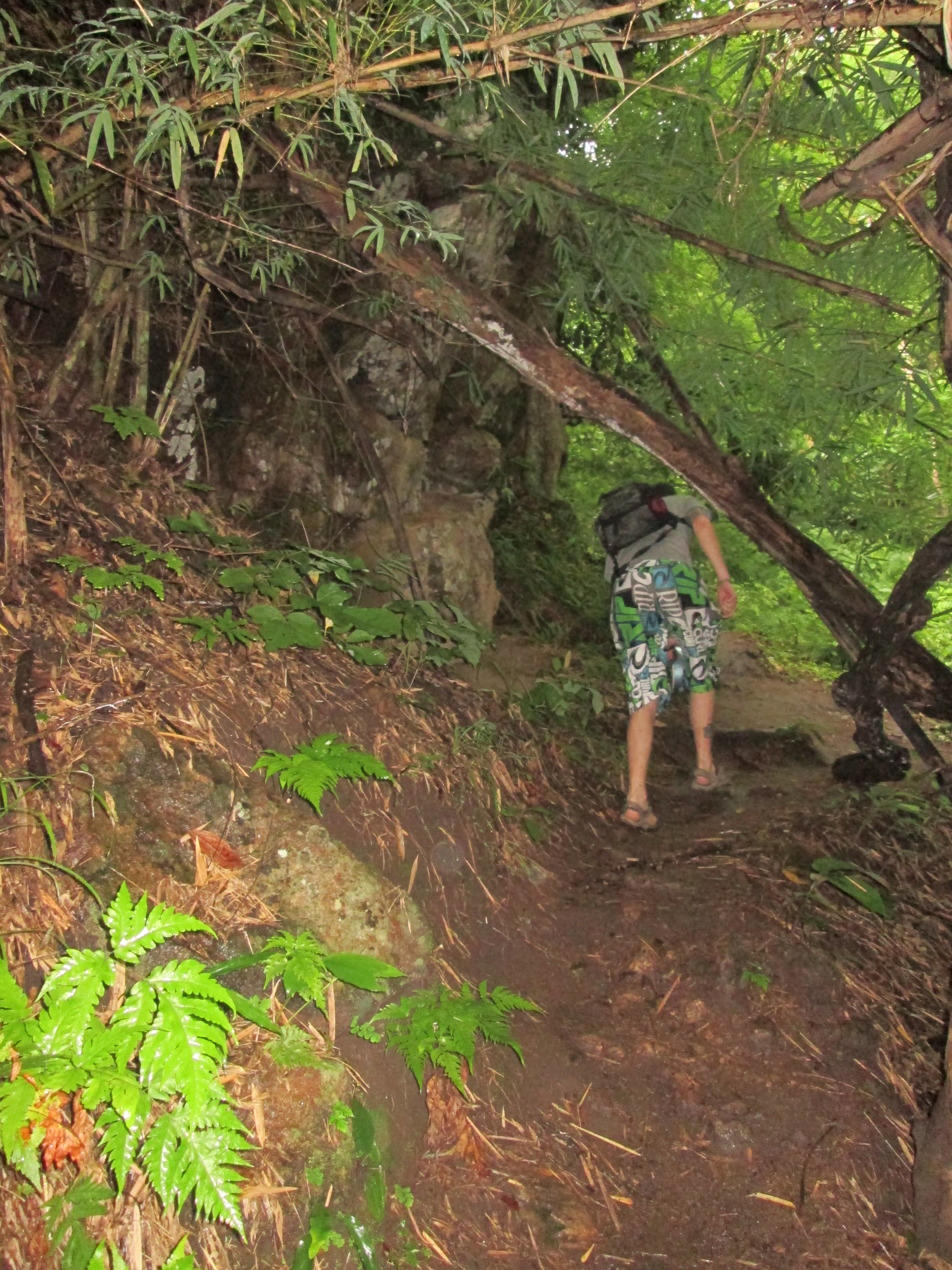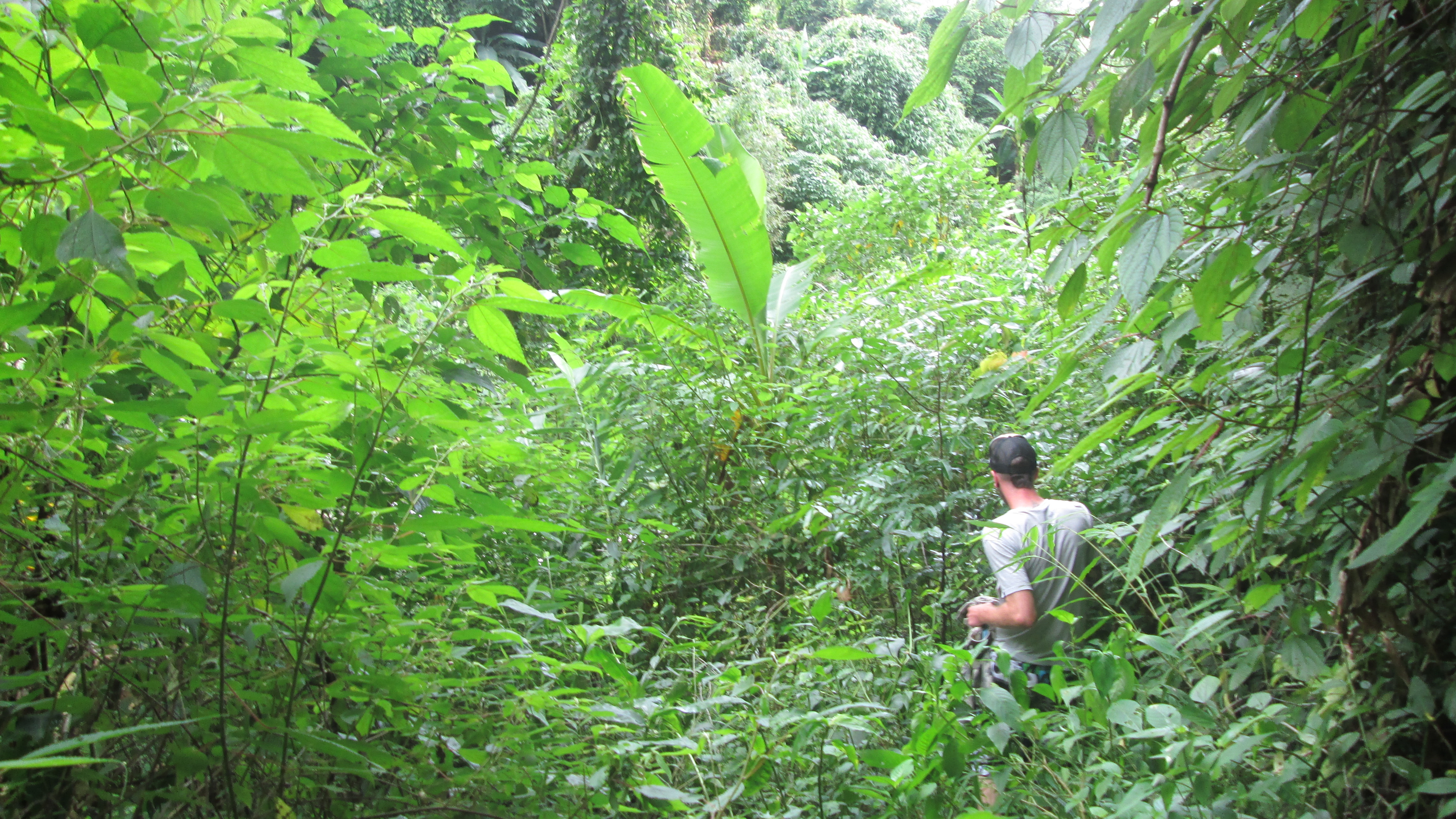 Vol verbijstering kijken we naar beneden en zien we weer een kleine lagune, deze letterlijk omringd door jungle. We hebben ons subtropisch zwemparadijs gevonden!! Ik wil erin plonsen!! Één probleem, de rotsen zijn hier te glad en te steil om verder te gaan… Hoe komen we nu beneden? We kijken links van ons; steile bergwand. We kijken rechts van ons; steile dichtbegroeide jungle, zonder ook maar een enigszins bewandelbaar pad. Maar het zou eventueel tóch een mogelijkheid kunnen zijn… We kijken elkaar aan met een kleine twinkeling in de ogen. Gaan we ervoor? Ja we gaan ervoor! Niet wetende hoe steil het achter het groene bladerendek zal zijn. Niet wetende of we eenmaal beneden ook wel weer naar boven kunnen. Maar gedreven door super veel enthousiasme, rapen toch we al onze moed bij elkaar en stappen de jungle in.