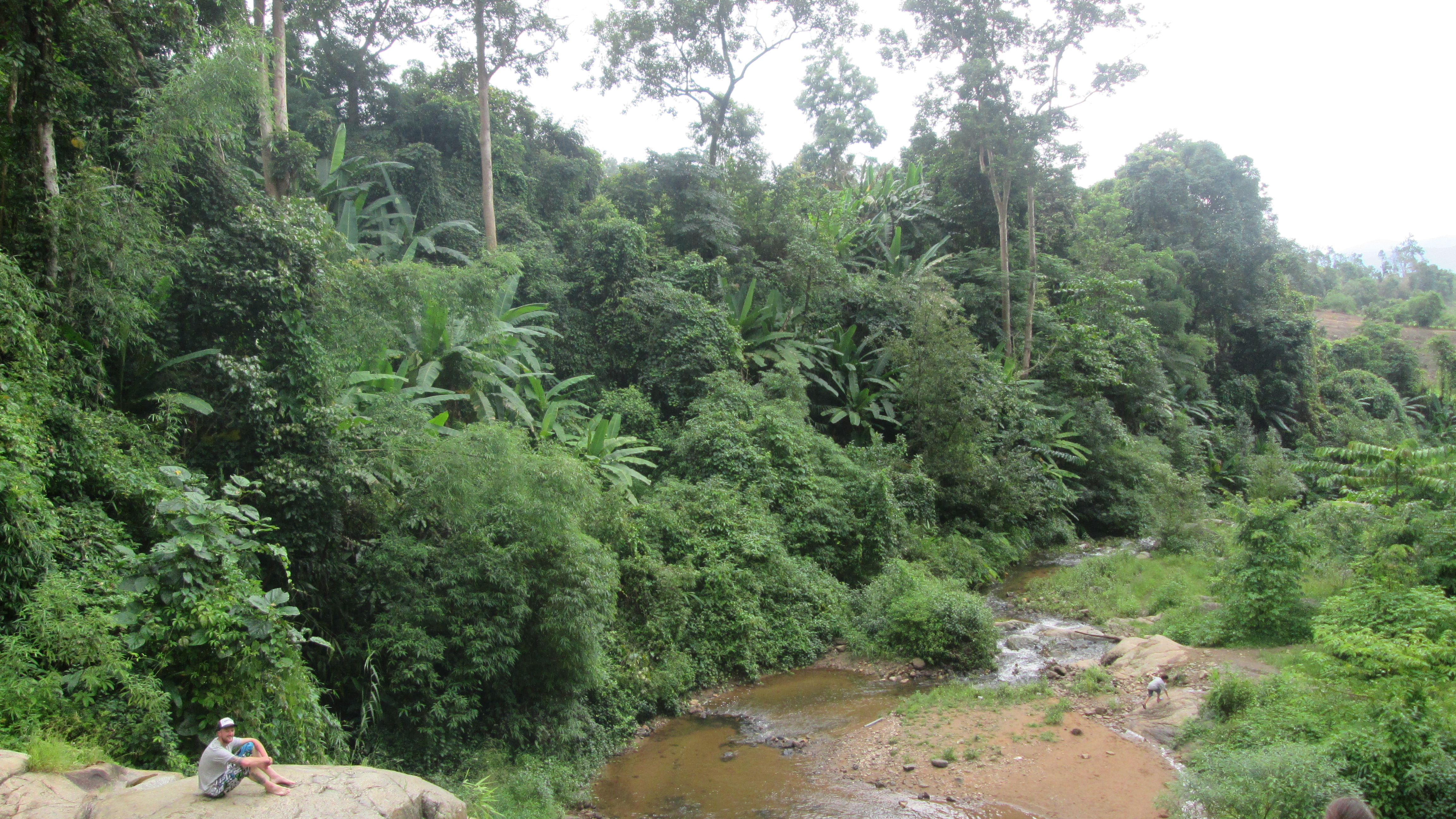 We klimmen een klein stukje langs de rotspartij omhoog, zetten ons neer en genieten van het uitzicht. Het is prachtig om halverwege de waterval te zitten, uitkijkend over de jungle. Onder ons de medetoeristen die dankbaar hun voetjes baden in de kleine lagune waar de waterval in eindigt. Alhoewel… Eindigt deze waterval daadwerkelijk wel hier…?