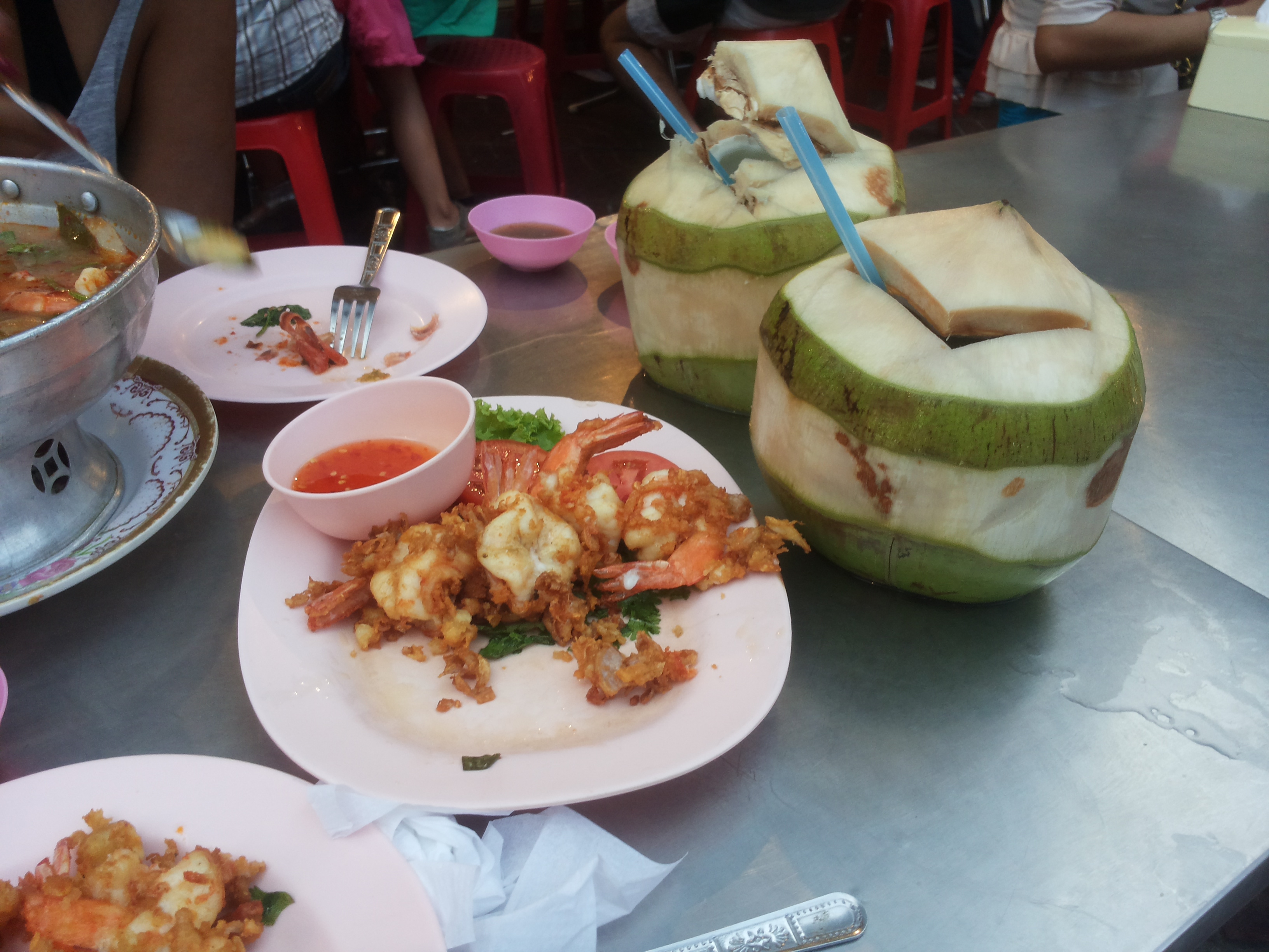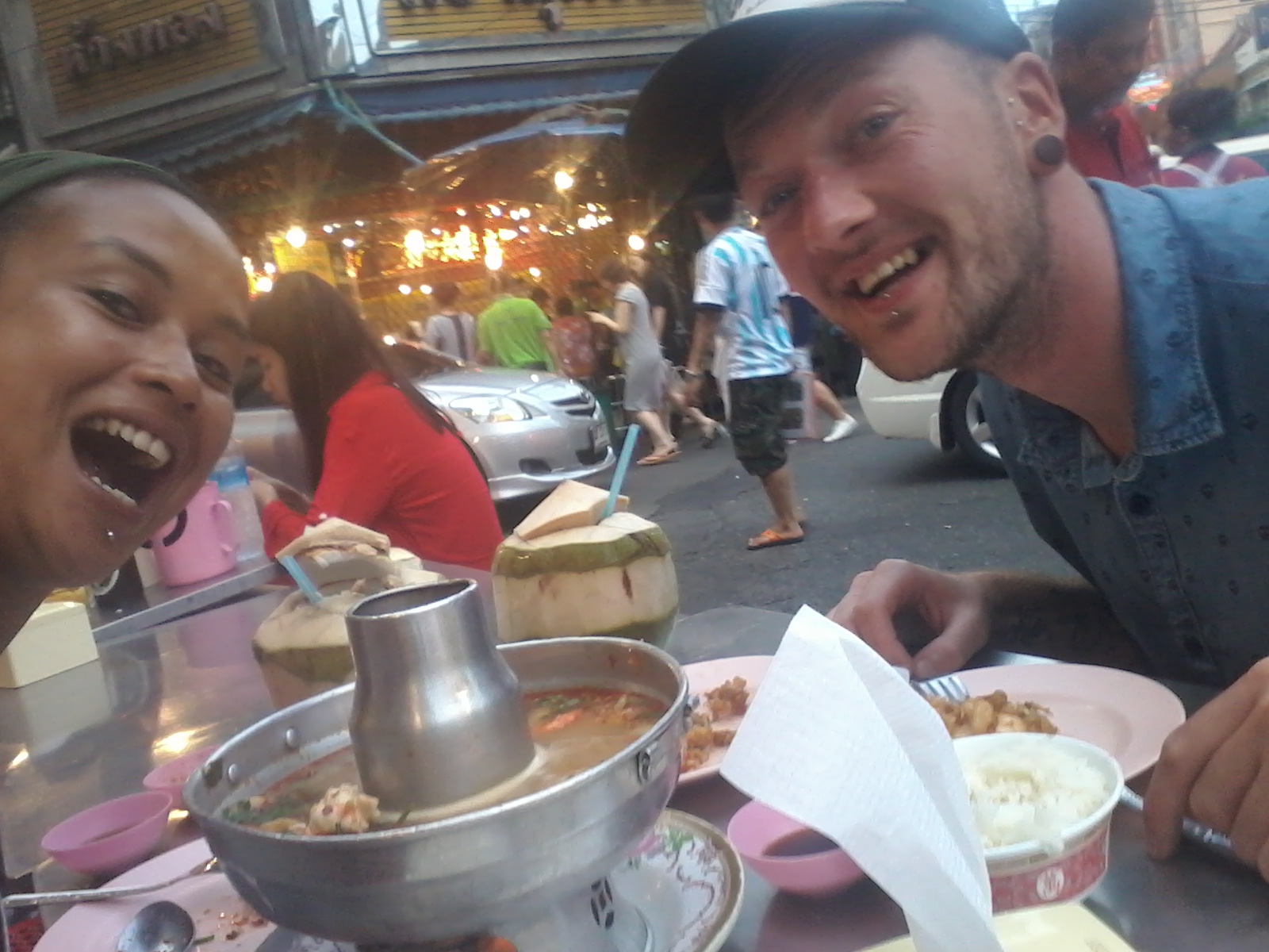 Mini squidEr moet natuurlijk ook genoeg gedronken worden!Het is misschien geen Duvel, maar zo’n thaise goudgele rakker smaakt ook prima!Bunkeren in chinatown, Bangkok (grootste chinatown ter wereld!)Vis moet zwemmen, hier zwemt ie in de kokosmelkGoed begin van de dag!Een keer zondigen met een verse homemade burger mag af en toe best..’En een “streetfood style”” pizzaatje smaakt ook prima zo nu en danThai fast foodKan niet kiezen tussen al dat lekkers!Dennis al bijna een master of the chopsticksGulzig?Tom Yum, my alltime favorite!!Crispy pork!Ach kom, we nemen nog een biertjeOok de verse kokosnoot smaakt me al te best!TeatimeResultaat na al dat schransen