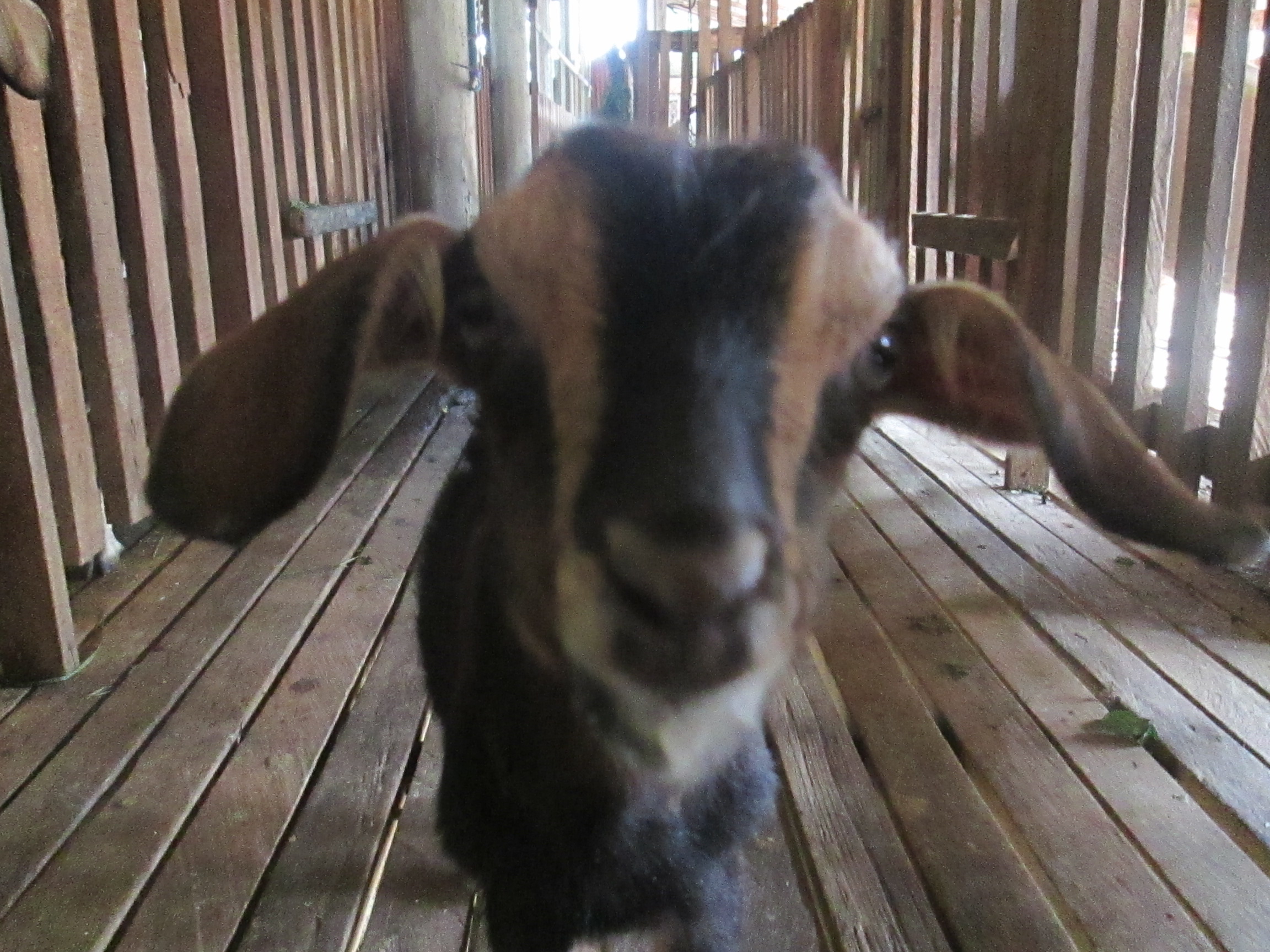 M’n geit ondergaat kalm het melkritueel, duidelijk gewend aan dit hele gebeuren. Broeder geit komt ondertussen nieuwsgierig kijken bij ons, snuffelt wat aan mijn oor en neemt vervolgens heel traag en voorzichtig een hap naar mijn oorbel. “Hey joh, laat dat!!” Ik kijk hem boos aan, maar broeder geit lijkt niet onder de indruk van mijn uitbrander. Integendeel zelfs, hij blijft me stoïcijns aankijken met die enorme ogen van hem, ogen die veelte groot lijken voor z’n gezicht, en met de kop een beetje scheef. Het is zo’n komisch gezicht dat ik spontaan in lachen uitbarst. Dennis kijkt me verrast aan, “Wat is er zo grappig?”. Niks hoor, gewoon wat gekkegeit…
