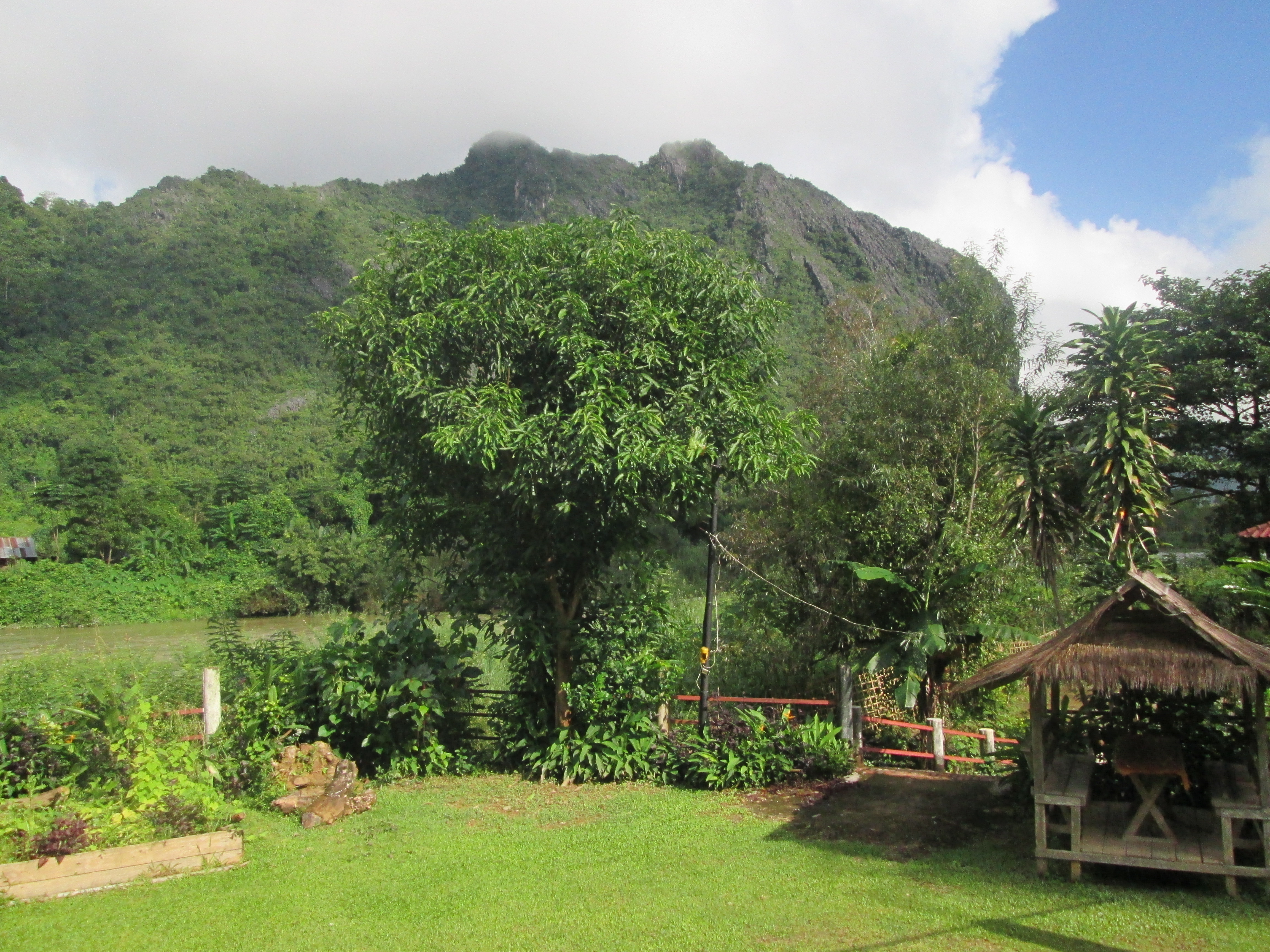 We bevinden ons op enkele kilometers van het hedonistische plaatsje Vang Vieng, op een organische boerderij. Deze boerderij kan je vrijblijvend bezoeken om een kijkje te nemen bij hun organische fruitteelt en geitenkaasmakerij maar je kan er ook gewoon een kopje van hun zelfgemaakte thee komen drinken terwijl je geniet van het prachtige uitzicht op zowel de rivier als de bergen. Je kan er echter ook een paar dagen verblijven en overnachten om vrijwilligers werk te doen, helpen met klusjes op en om de boerderij en zo een beter beeld te krijgen van het reilen en zeilen tussen de hooibalen. En dat is precies wat ons plan hier ook is.