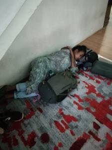 De eerste vlucht die slechts 4 uur duurde was eigenlijk al te kort om écht te kunnen slapen. En de laatste vlucht vanaf Maleisië al helemaal. We hebben dus zo goed en zo kwaad als het ging die 5 uur “overlay” proberen te gebruiken om toch wat uurtjes in dromenland door te kunnen brengen. Wat er uiteindelijk in resulteerde dat we in professionele zwerverstijl op de grond in de vlieghaven onder een sjaal hebben liggen tukken. Reizen. Je moet er wat voor over hebben…