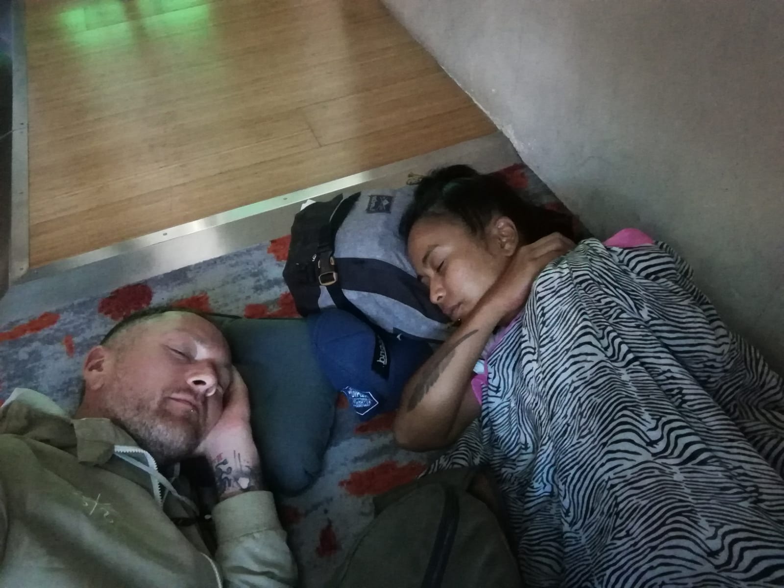 De eerste vlucht die slechts 4 uur duurde was eigenlijk al te kort om écht te kunnen slapen. En de laatste vlucht vanaf Maleisië al helemaal. We hebben dus zo goed en zo kwaad als het ging die 5 uur “overlay” proberen te gebruiken om toch wat uurtjes in dromenland door te kunnen brengen. Wat er uiteindelijk in resulteerde dat we in professionele zwerverstijl op de grond in de vlieghaven onder een sjaal hebben liggen tukken. Reizen. Je moet er wat voor over hebben…