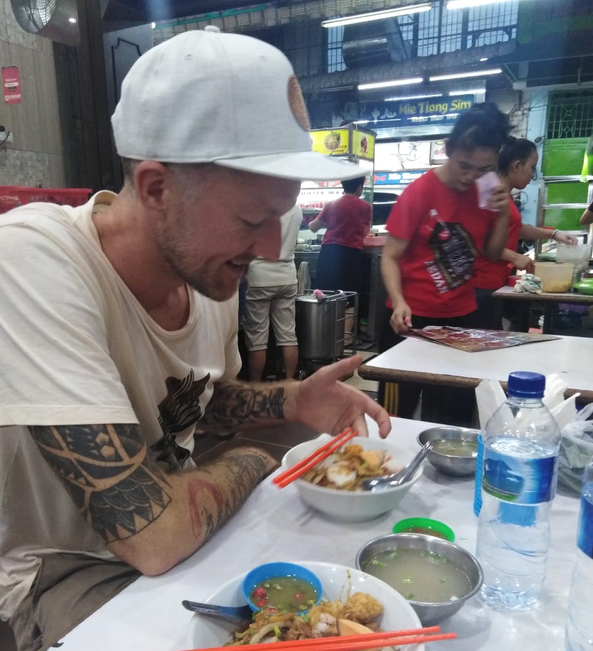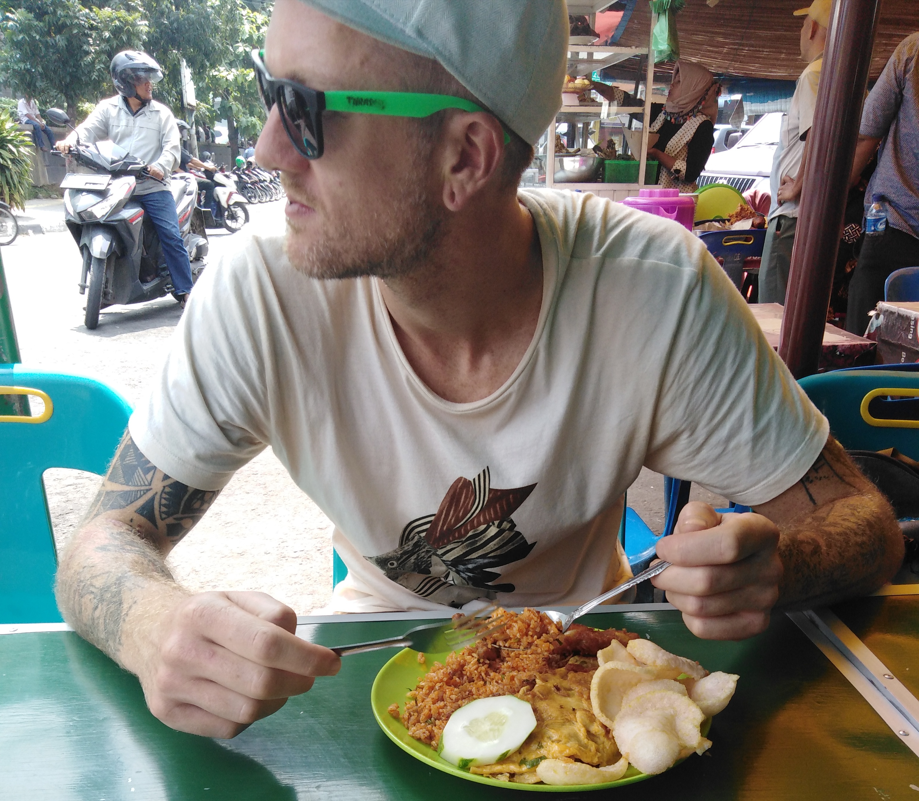 “Can we have two nasi goreng, please?” vraagt Dennis aan het kleine dametje van het eettentje.