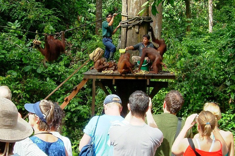 Veel van de gidsen die daar tegenwoordig de toeristen mee op trek nemen, lappen die regels echter aan hun laars. Zij doen er alles aan om zoveel mogelijk orang oetans te lokken en deze van zo dichtbij mogelijk te kunnen zien. Immers: Veel orang oetans spotten is een blije toerist. Een blije toerist is veel geld in het laatje. En veel geld in het laatje is weer een blije gids!